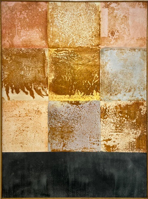 “ Returning — This oxidation on polyester work was created first with a sheet metal relief print creating the composition, and an acrylic wash with the muted colors followed. I attempt to create a balance of tension/chaos between the natural, uncontrolled rust and the structure/organization of the simple block pattern."